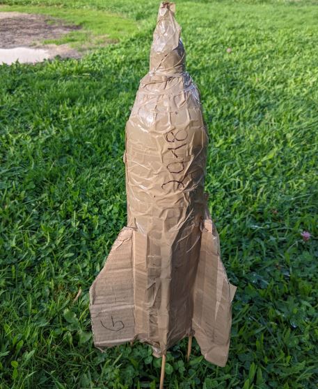 2. Als nächstes haben wir die Flügel aus Pappe ausgeschnitten und an die Rakete geklebt.
