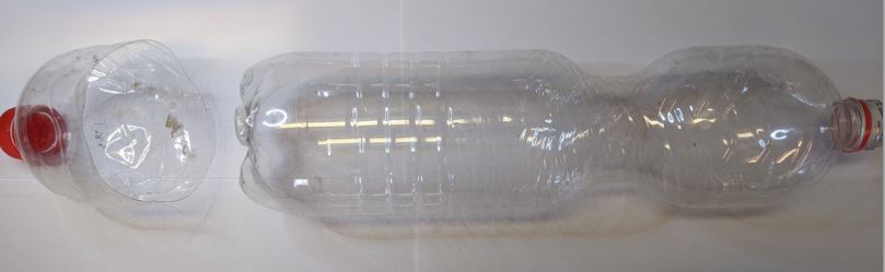1. Wir haben die Oberseite der PET Flasche abgeschnitten und auf die Unterseite der anderen Flasche gesteckt. Dann haben wir die beiden Teile mit Klebeband zusammengeklebt.